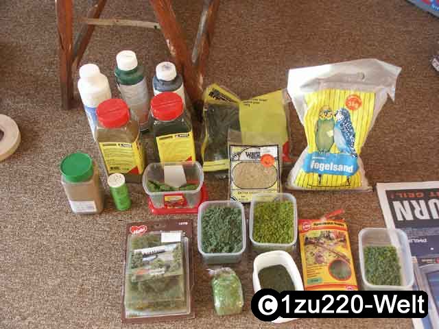 Die nackten Felsen wurden im letzten Schritt fertiggestellt. Da diese aber nicht natürlich wirkt und in der Natur an jeder nur einigermaßen ebenen Stelle Gräser und Büsche wachsen, werden die Felsen jetzt mit Streumaterial behandelt. Ich habe hier mal ein Bild von einer Auswahl der auf der Anlage verwendeten Materialien gemacht.