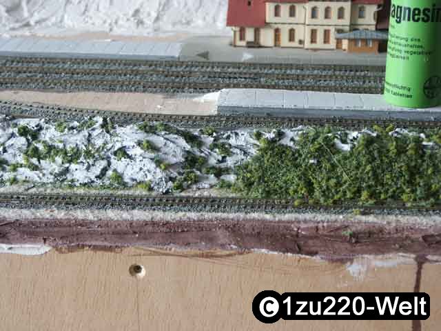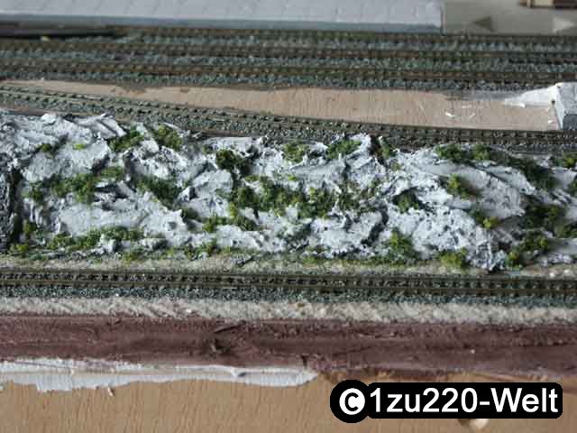 3. Die für mich geeignetste Methode ist, Weißleim punktuell oder in Streifen auf die Felsen auftragen und dann dick mit den Flocken bestreuen. Dann nach der Trockenphase das Ganze mit dem Staubsauger (Damenstrumpf vorne rein, zum Auffangen der Flocken) absaugen.