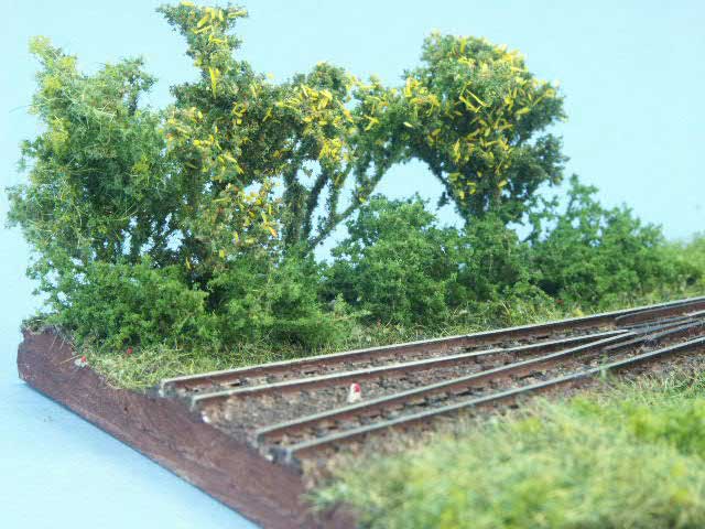 Jetzt kam das Grünzeug. Vorher wurde noch der Weg zum Stellwerk mit feinem braunen Sand gestaltet. Dann kam mein schon bekanntest grünes Gemisch auf die Gipsfläche. Auf diese Grundierung wurden dann alle anderen Gräser und Sträucher aufgeklebt. Den letzten Schliff erhielt das Diorama noch durch die größeren Bäume aus dem schon verwendeten Meerschaum.