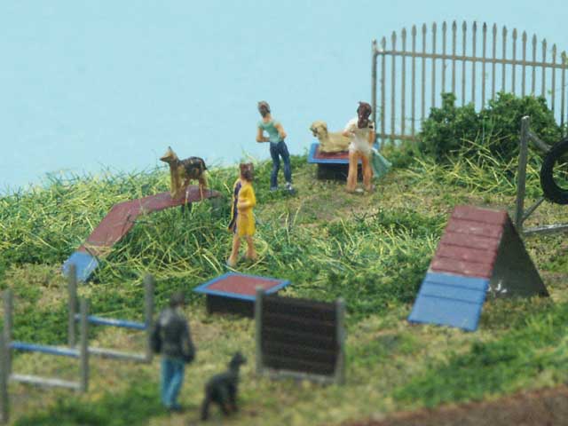 Zwischen den Geräten und an den Rändern bilden groben Flocken und Meerschaum die übliche Vegetation nach. Quer an einer Ecke entstand eine kleine Straße, die mit einem Zaun zum hin Platz abgetrennt ist. Als letztes fanden noch die Hunde und ihre Herrchen und Frauchen ihren Platz auf das Diorama. Diese Figuren habe ich bei Trafofuchs.de erworben.