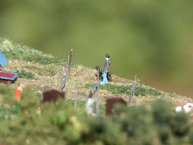 Darauf wurde eine Grundierung aus feinen dunkelgrünen Flocken aufgetragen, und die Geräte in Form eines kleinen Parcours aufgeklebt. Die späteren Wege zwischen den Geräten wurden wieder mit Wasser getränkt, welches den Leim anlöst. So kann man die Flocken wieder leicht entfernen. Die Lücken wurden dann mit feinem braunen Sand aufgefüllt, um das zertrampelte Land zu imitieren.