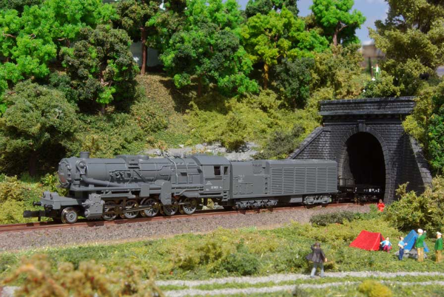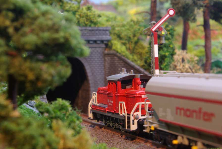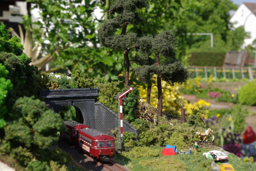Als kleiner Eye-Catcher habe ich mit dem Stemmeisen noch etwas Felsen im Anschluss an die Stützmauer des Tunnels geschnitzt. Nach dem Färben in grau wurde mit kleinen Steinchen und Schotter etwas Geröll nachgebildet und ein paar Büsche und Gras gepflanzt. Auch der Weg im Vordergrund wurde mit fein gemahlenem Schotter aufgeklebt. Danach erfolgte der übliche Auftrag von grünem Streumaterial in verschiedenen Größen und Färbungen.