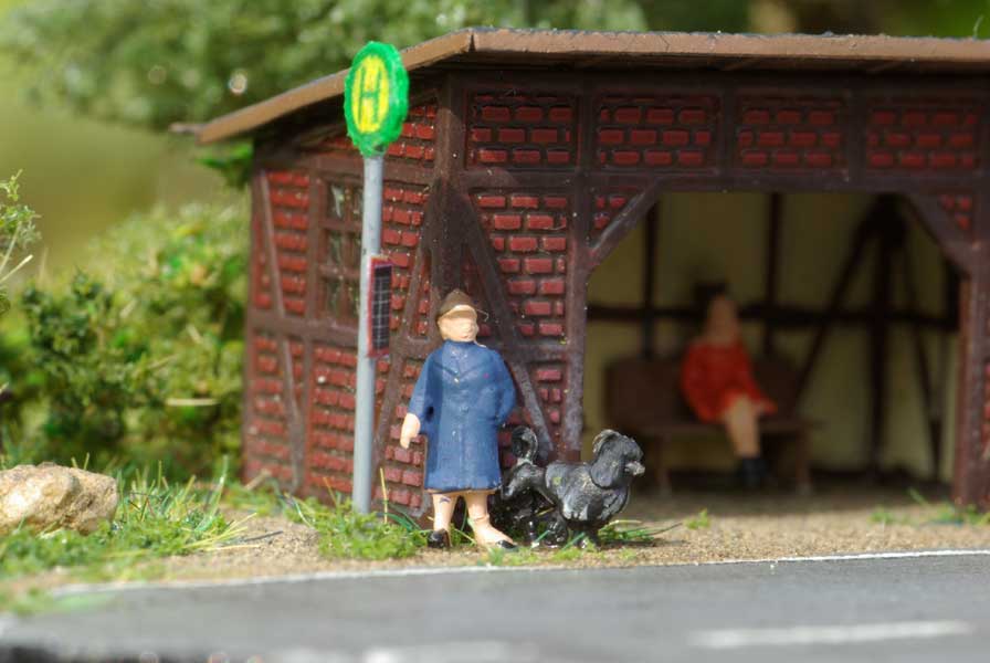Den Abschluss bilden die Figuren (irgendwann mal ein Paket bei ebay gefunden), das Schild (bedrucktes Papier, 0,3mm Draht) und ein paar kleine Grasbüschel am Straßenrand (Kleckse Weißleim mit Flasche begrast).