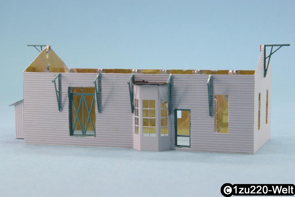 Das erste Problem tauchte beim Erker auf, der stumpf an die Wände gelötet werden sollte, keine Chance. Dann wollte ich die Dachsparren montieren, entweder hielt die Lötstelle nicht oder die benachbarten Balken sind wieder abgefallen. Ich musste an dieser Stelle also abbrechen und wieder ans Zeichenbrett wechseln.