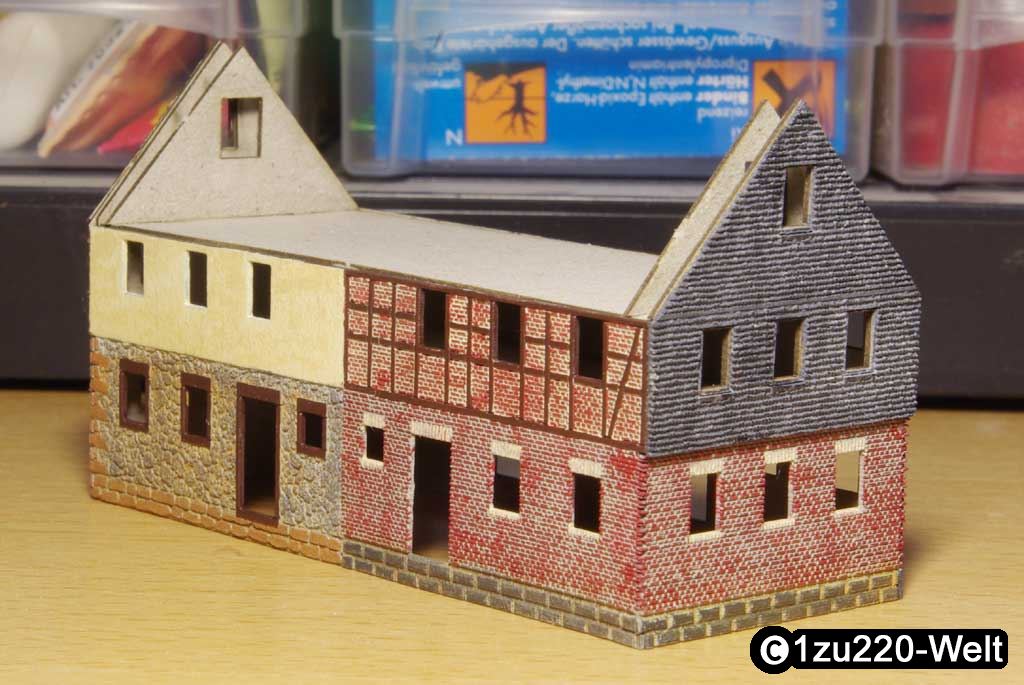 Was mir jedoch etwas missfällt, ist die unterschiedliche Verwirklichung des Fachwerks. Auf einer Seite ist es aus Echtholz, welches in die Pappe eingelegt wird, auf der anderen Seite ist die Struktur nur in die Pappe graviert. Das ist für mich unverständlich. Ich sehe keinen Grund, warum nicht auch hier Echtholz verbaut werden sollte.