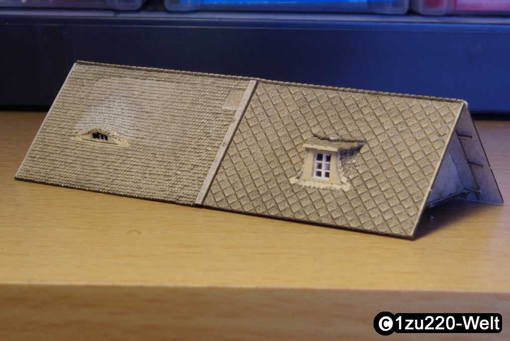 Jetzt musste das Dach noch seine Farbe erhalten. Ich habe mich bei der einen Hälfte für dunkelgrauen Schiefer entschieden und die andere mit Tonziegeln eingedeckt. Dabei erfolgte der Farbauftrag in folgender Reihenfolge: