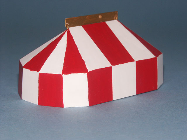 Auf Wunsch eines Bekannten, der ein Zelt für seinen Kirmesplatz wollte, aber nicht genug Platz für auf dem Markt vorhandene hatte, habe ich dieses kleine Zelt gebaut. Die Teile sind auch wieder alle mit der CNC-Fräse hergestellt, jedoch hatte ich ein paar kleine Zeichenfehler, wodurch einiges gespachtelt werden musste. Da es sich jedoch (vorerst) um ein Einzelstück handeln soll, lohnte es sich nicht die Zeichnung noch einmal zu ändern und neu zu fräsen. Man sieht ja auch durch das Verspachteln keine Fehlerstellen. Es können höchstens ein paar Kanten nicht ganz übereinander passen, aber bei einem Zelt kommt das durchaus schon mal vor.