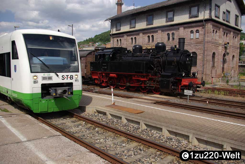 Von der Übergabe der Urkunden habe ich keine Bilder gemacht, da wird es in den Magazinen bessere Aufnahmen geben. Danach kam das eigentliche Highlight des Tages, im Bahnhof steht unser Sonderzug bereit. Mit 94 1538 soll in Donnerbüchsen der Rennsteig bezwungen werden. Vorher musste noch der reguläre Nahverkehr durchgelassen werden.