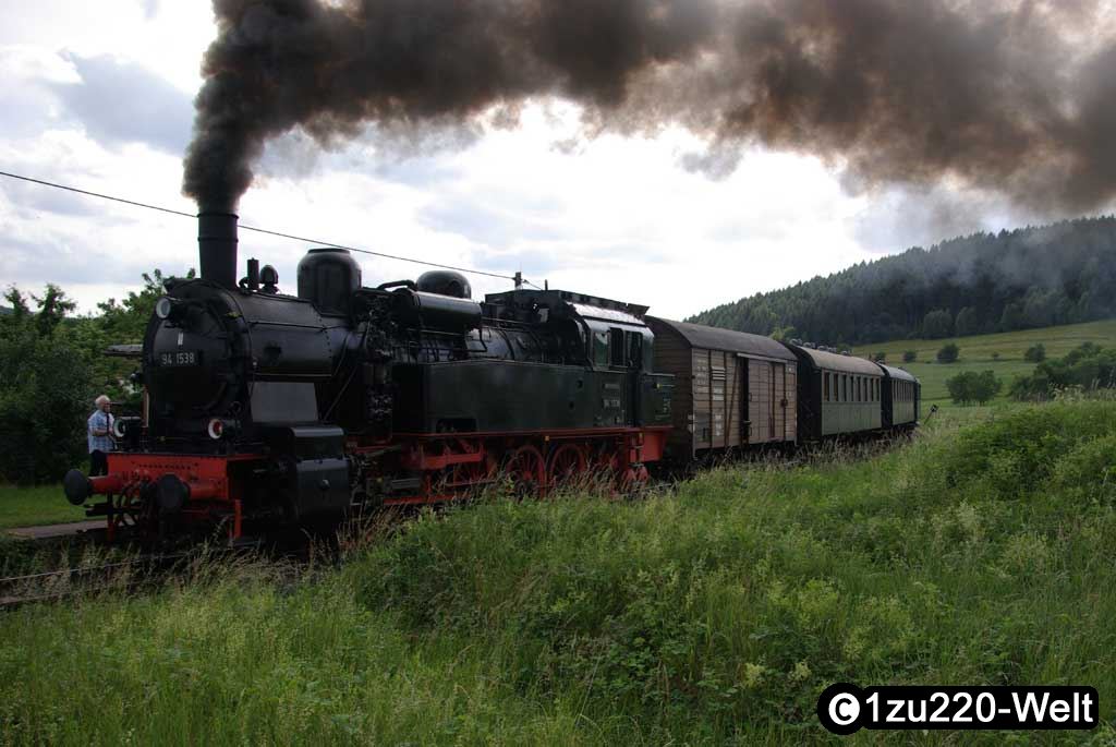 Dann ging es mit viel Dampf auf die Bergetappe. Am kleinen Haltepunkt "Rappelsdorf" wurde dann eine Scheineinfahrt veranstaltet. Nach dem Zurückstoßen kam 94 1538 mit einer schönen Rauchfahne angedampft.