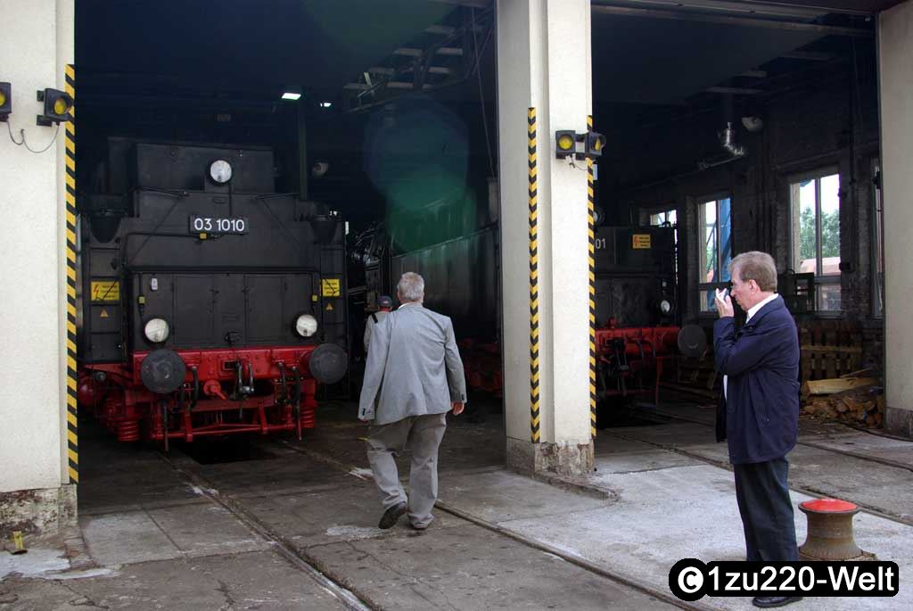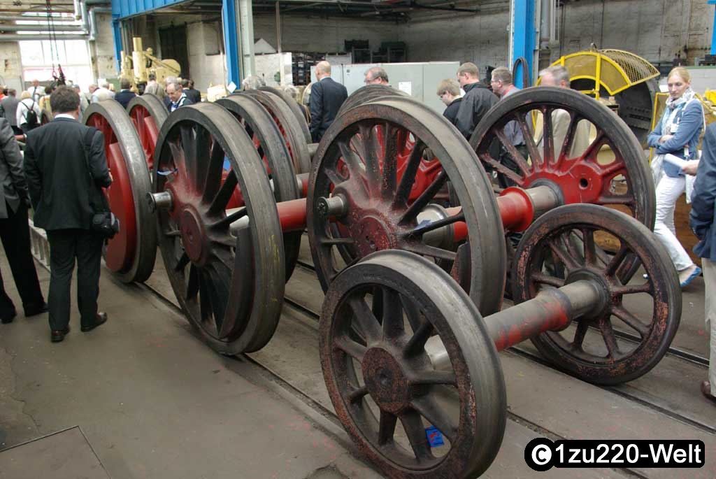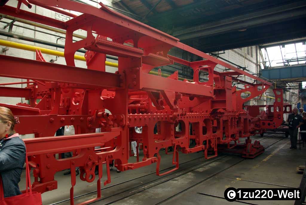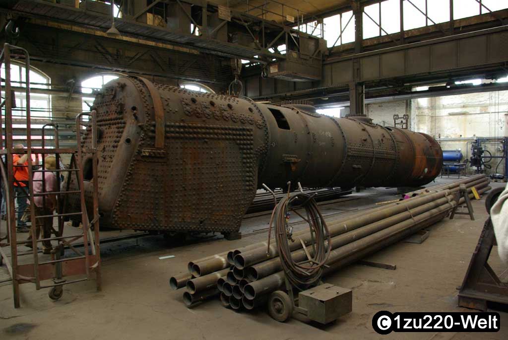 Der zweite zerstörte Dampfer ist 01 150, der wieder fahrbereit aufgebaut werden soll. Zu besichtigen war bereits der neu gebaute Kessel. Daneben stand noch der ausgeglühte, der laut Materialtests nicht mehr zu gebrauchen war.