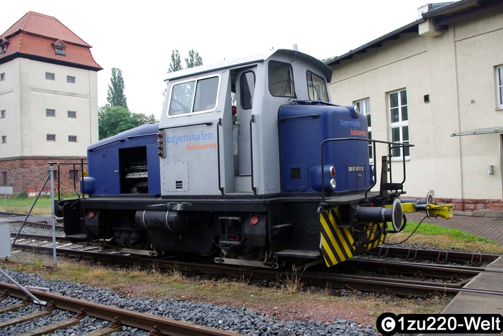 Nach kurzer Fahrt erreichten wir unser erstes Ziel: Aschaffenburg. Von der B 8 wechselten wir auf die B 26, die uns zum Stadtteil Nilkheim leitete. Hier befindet sich der Aschaffenburger Hafen. Wir fuhren an Fabrik- und Lagergebäuden vorbei, mussten den einen oder anderen LKW vorbeirollen oder rangieren lassen und erreichten nach kurzer Suche den Bahnhof und die Werkstätte der Hafenbahn Aschaffenburg. Im Lokschuppen fand Wolfgang einen freundlichen Mitarbeiter, der uns kurz die Abstellanlagen und die Werkstatt mit Drehscheibe usw. zeigte.